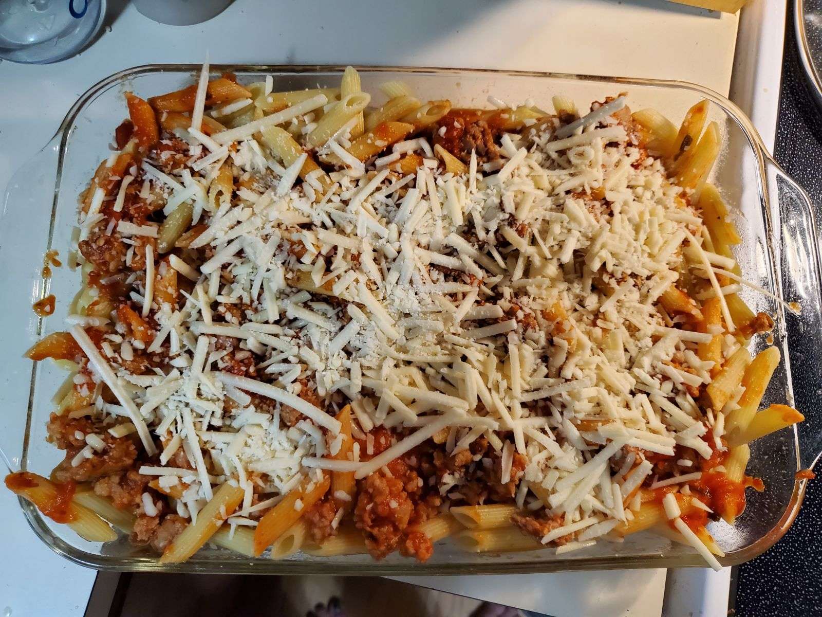 5. After the pasta and sausage has finished cooking, layer the sauce and pasta ontop of each other in a 7x11 glass casserole dish, top with Mozzerella.