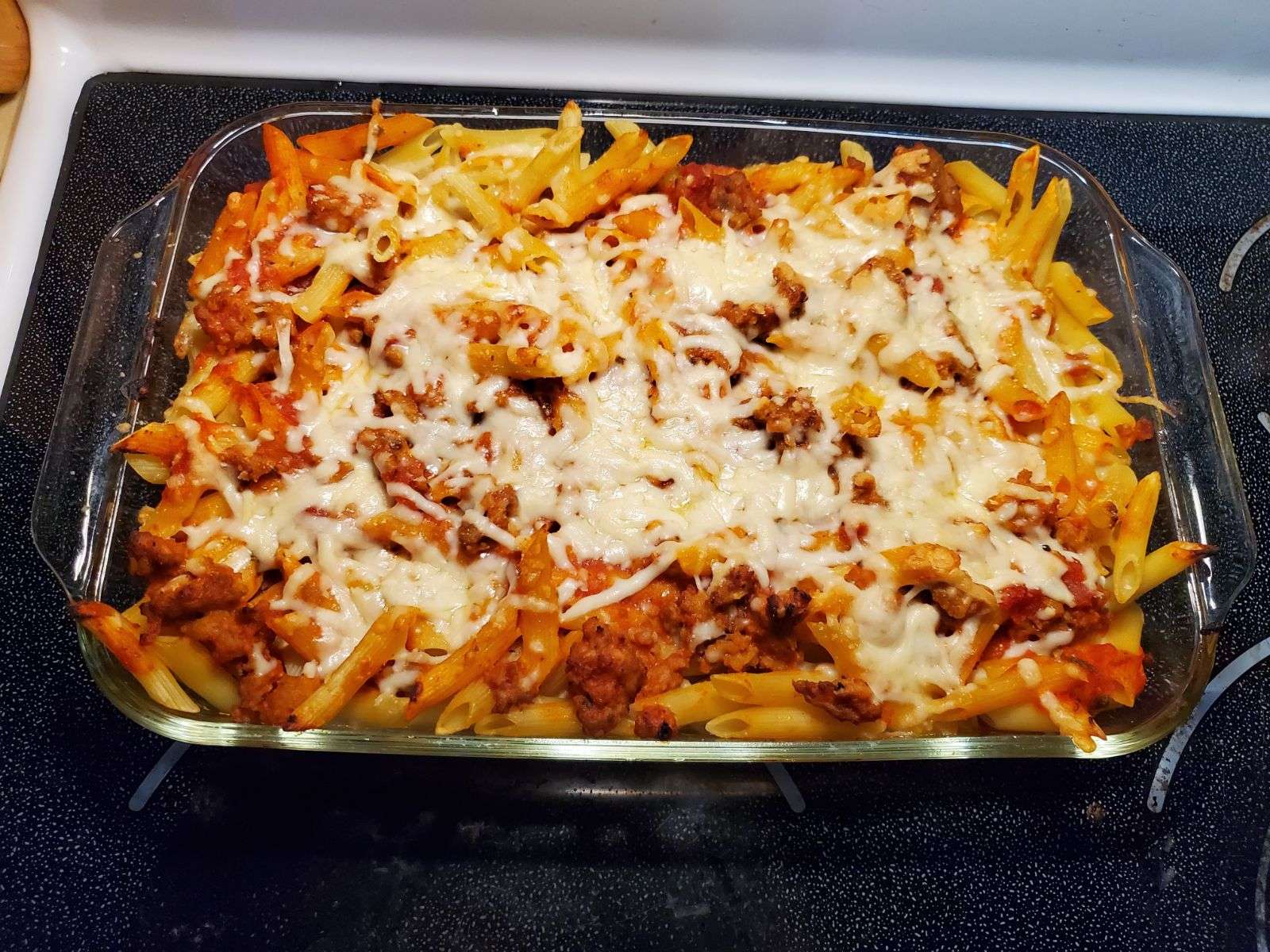 5. After the pasta and sausage has finished cooking, layer the sauce and pasta ontop of each other in a 7x11 glass casserole dish, top with Mozzerella.